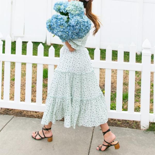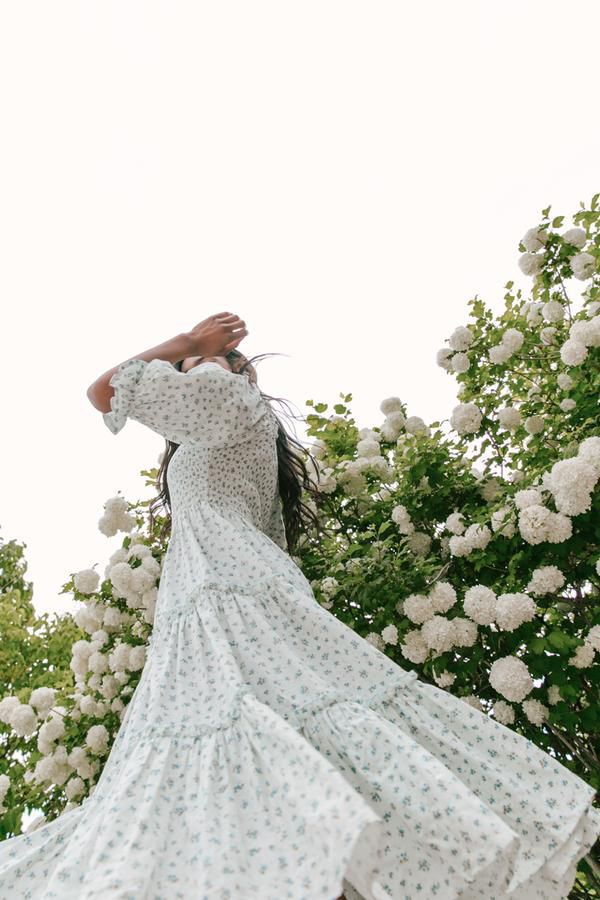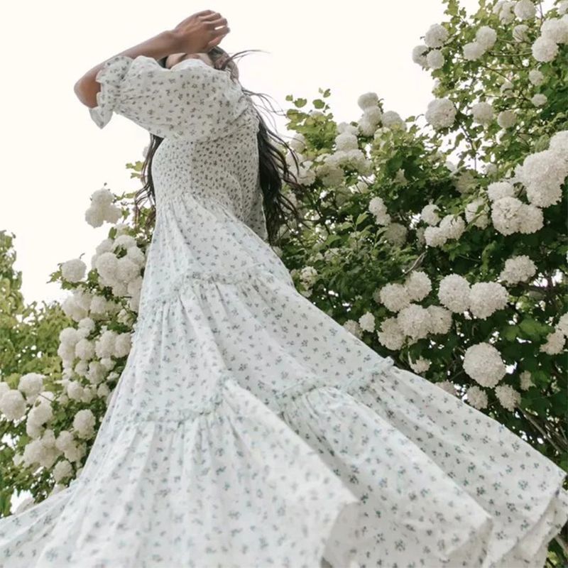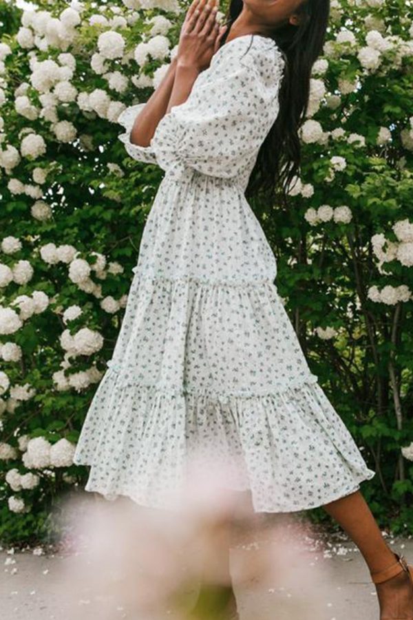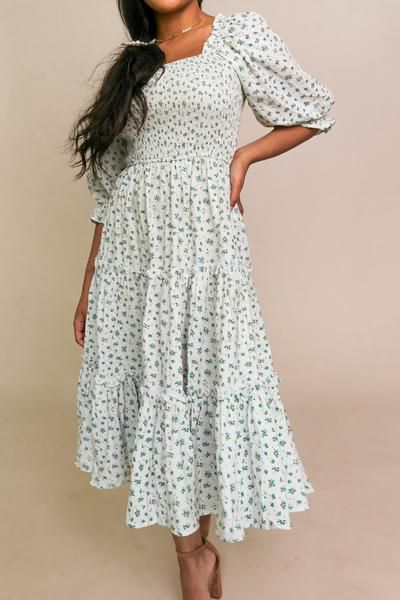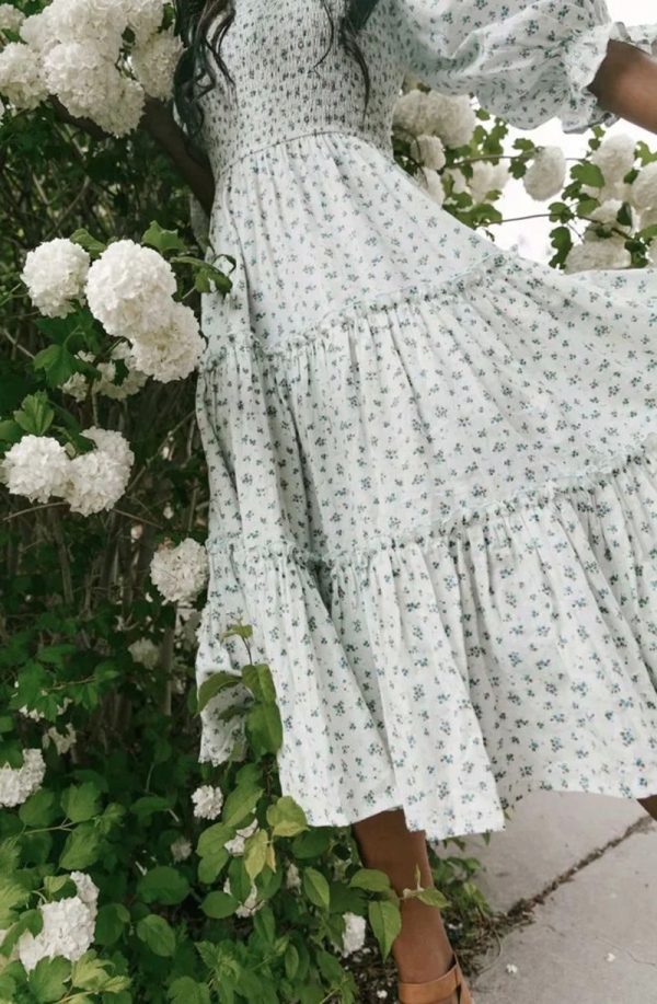 / Ditsy Micro Floral Smocked Bodice Ruffle Midi Dress Puff Sleeve