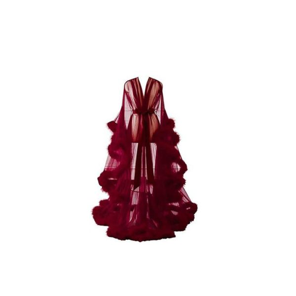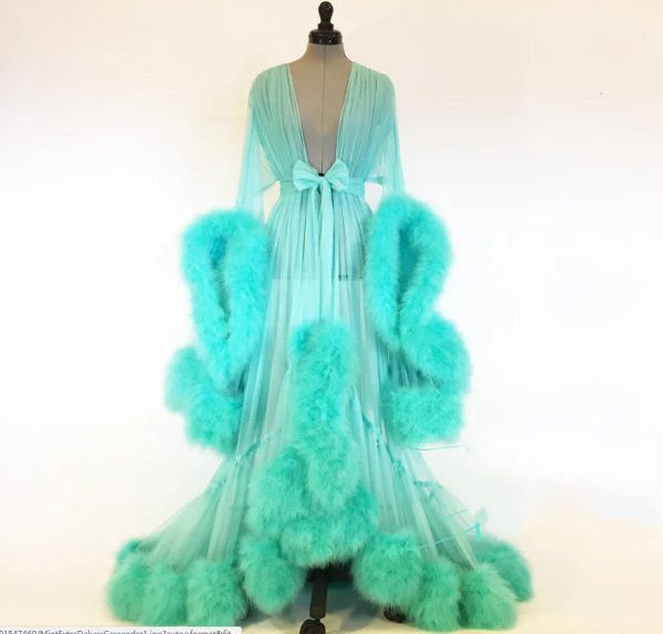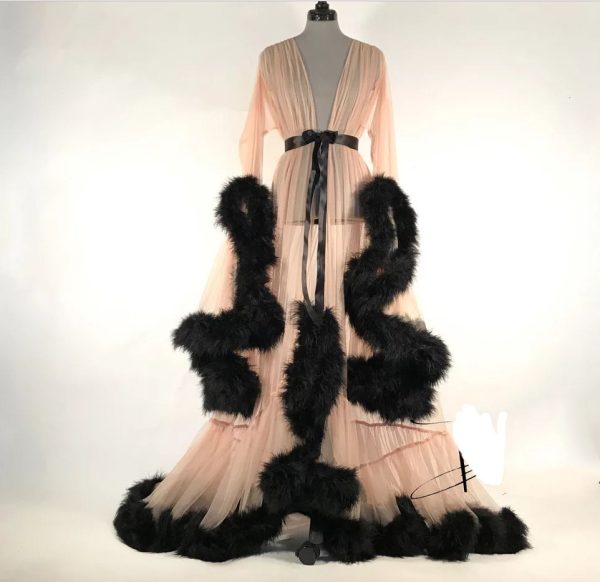 / Seductive Faux Fur Pom Pom Sheer Mesh Nightgown Pajama Robe