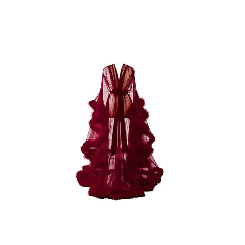 Seductive Faux Fur Pom Pom Sheer Mesh Nightgown Pajama Robe