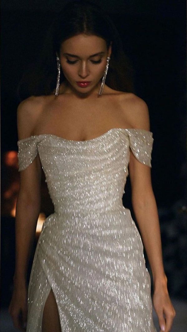 / Sparkly Off Shoulder Ruched Midi Dress With Thigh Split